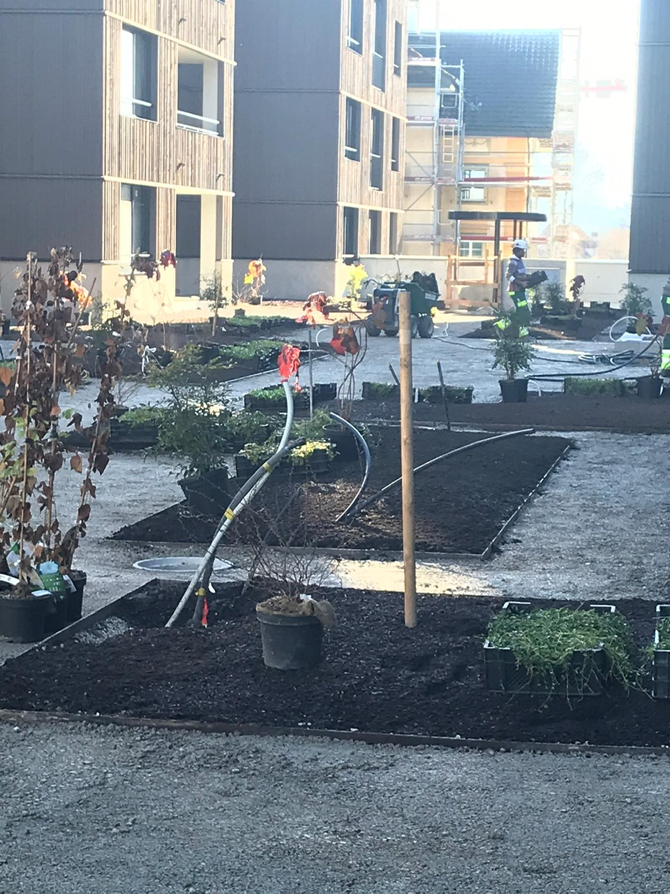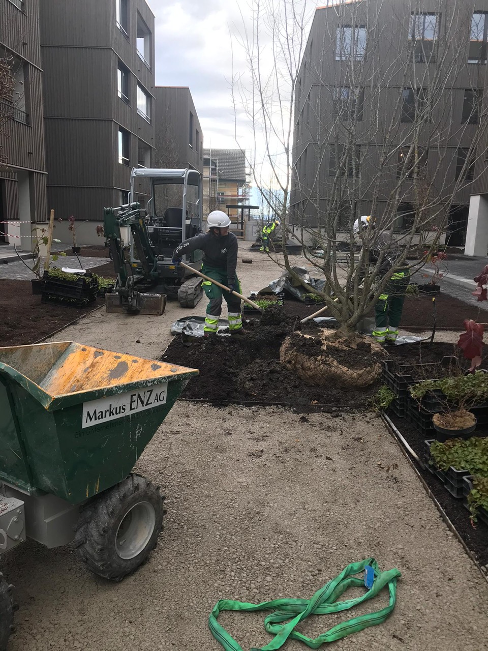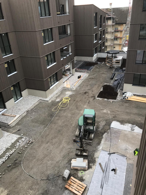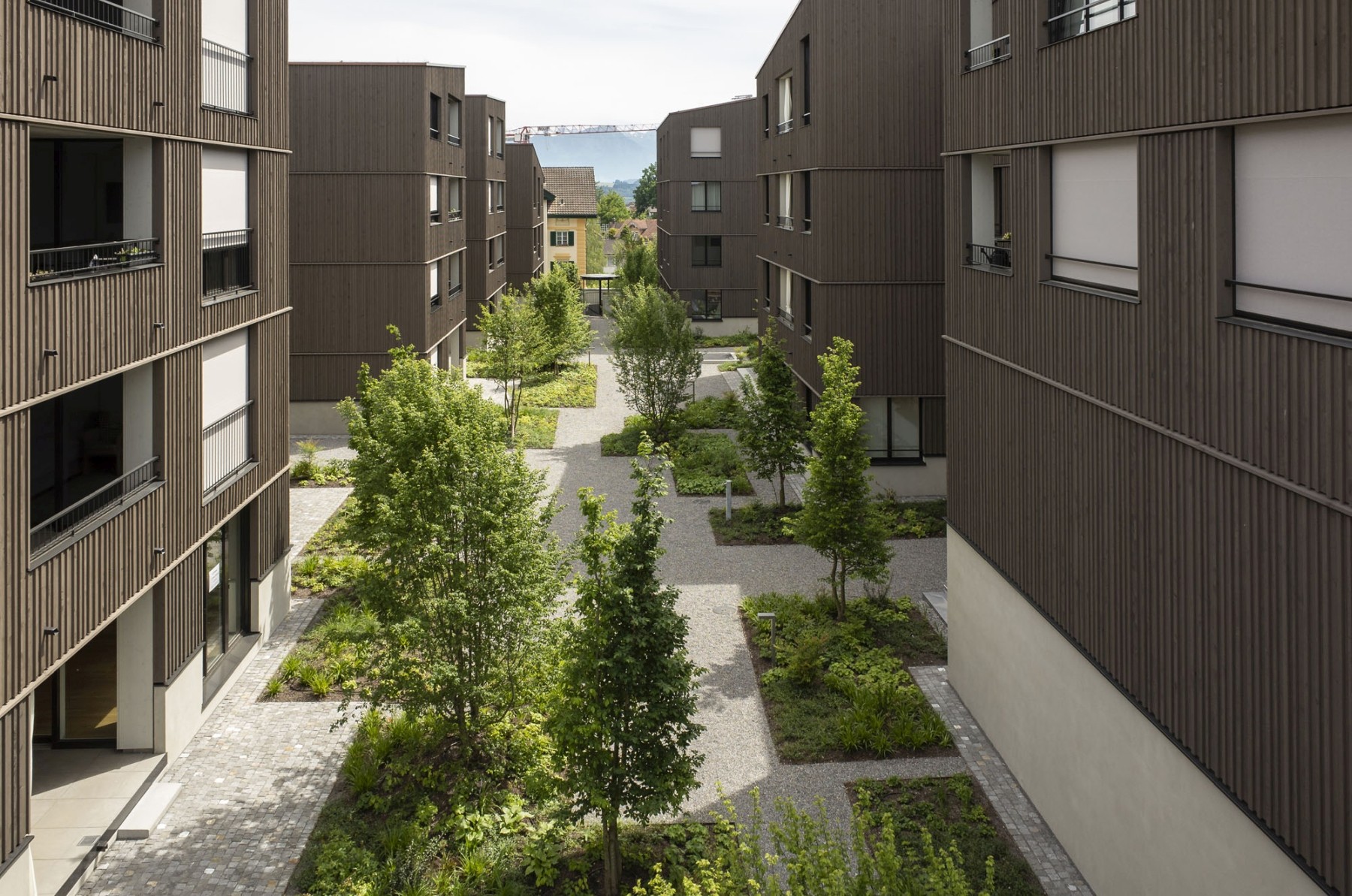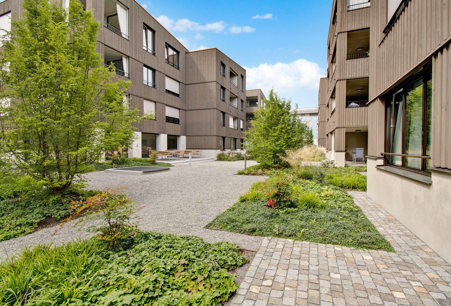 Im Aussenraum wird eine stimmungsvolle Atmosphäre mit hoher Aufenthaltsqualität und hohem Identifikationspotenzial geschaffen. Der Gartenhof ist als halböffentlicher durch die Bebauung lärmgeschützter Aussenraum und Begegnungsraum konzipiert. Die privaten Aussenräume der Wohnungen weisen eine hohe Privatsphäre auf.