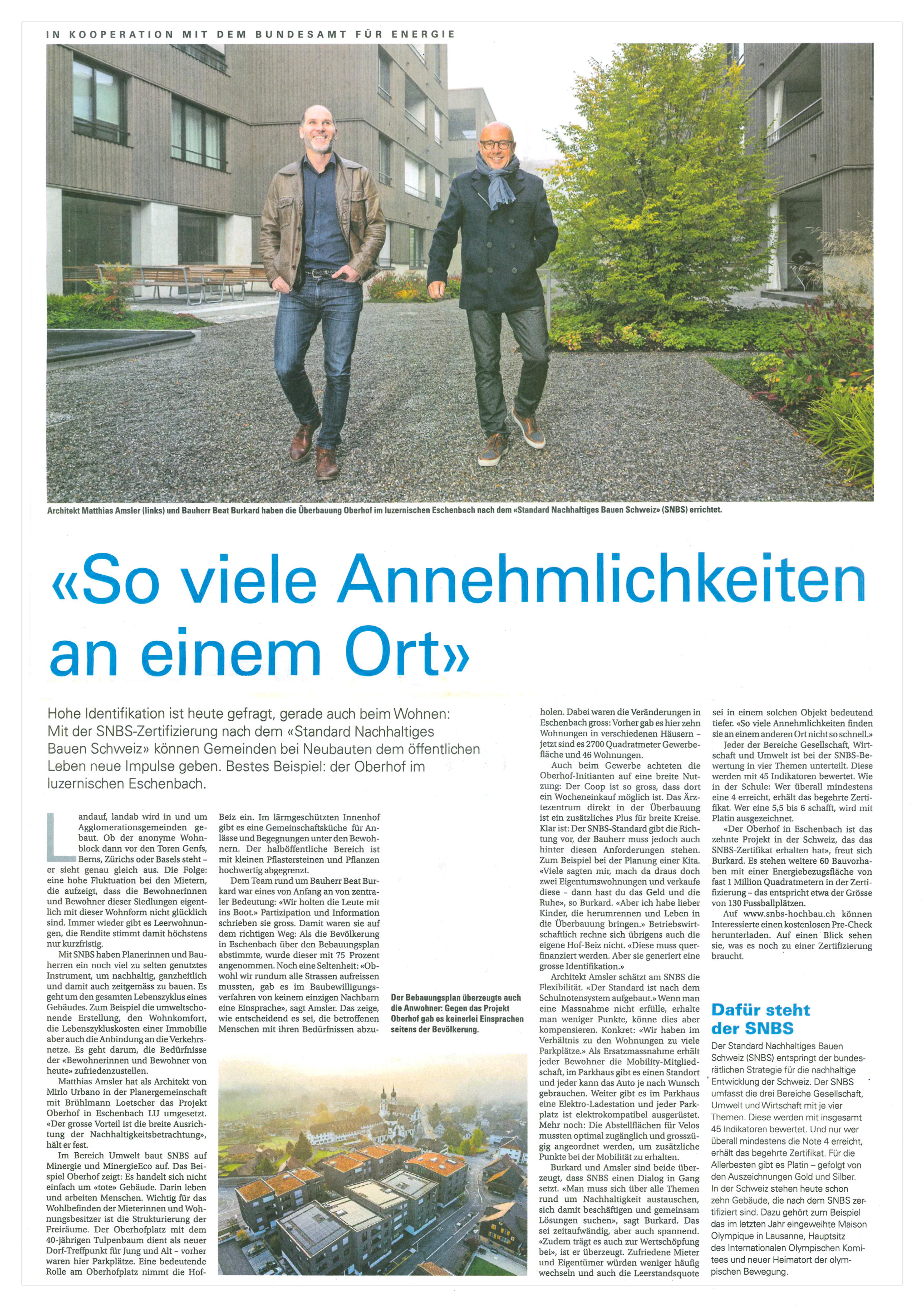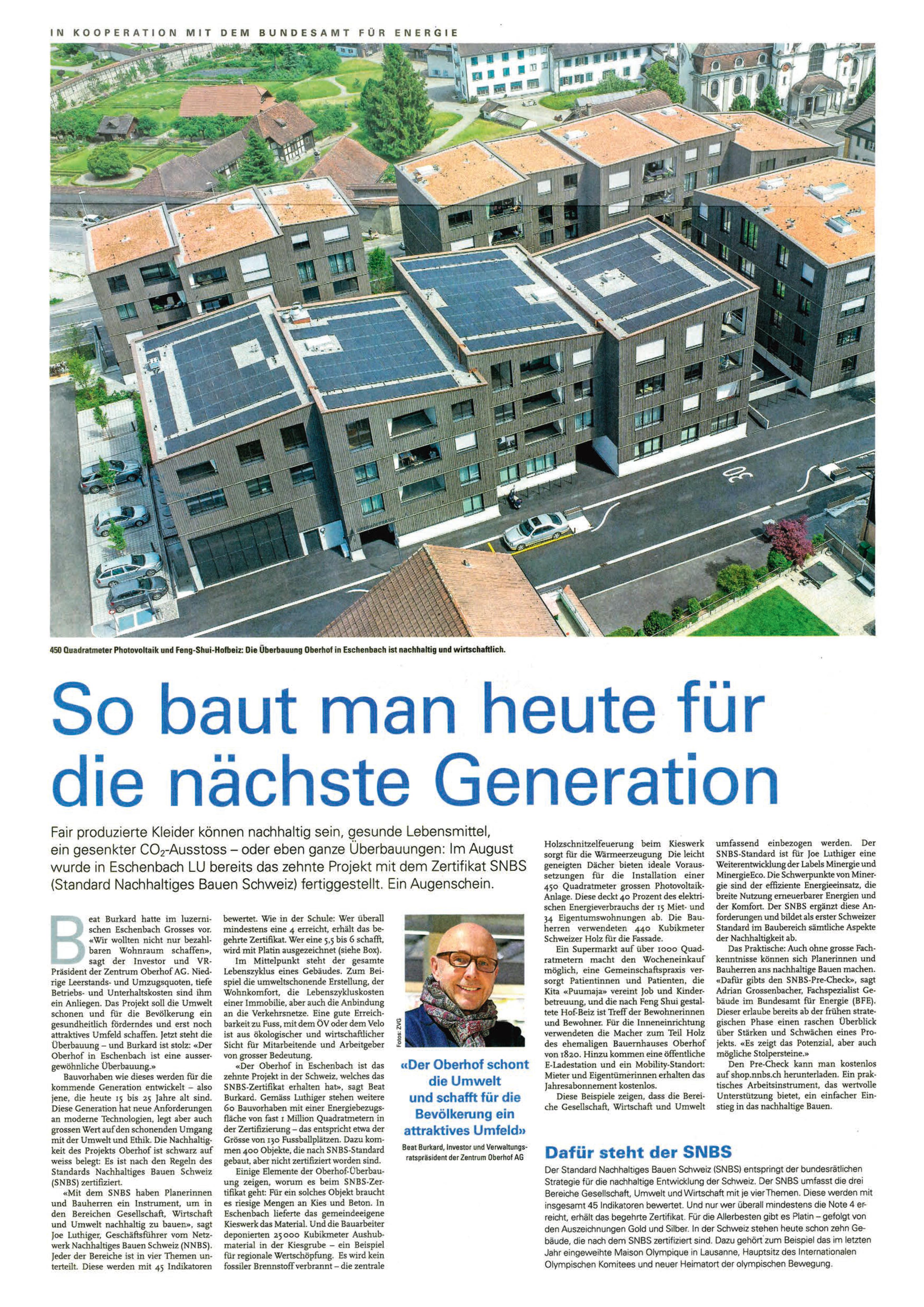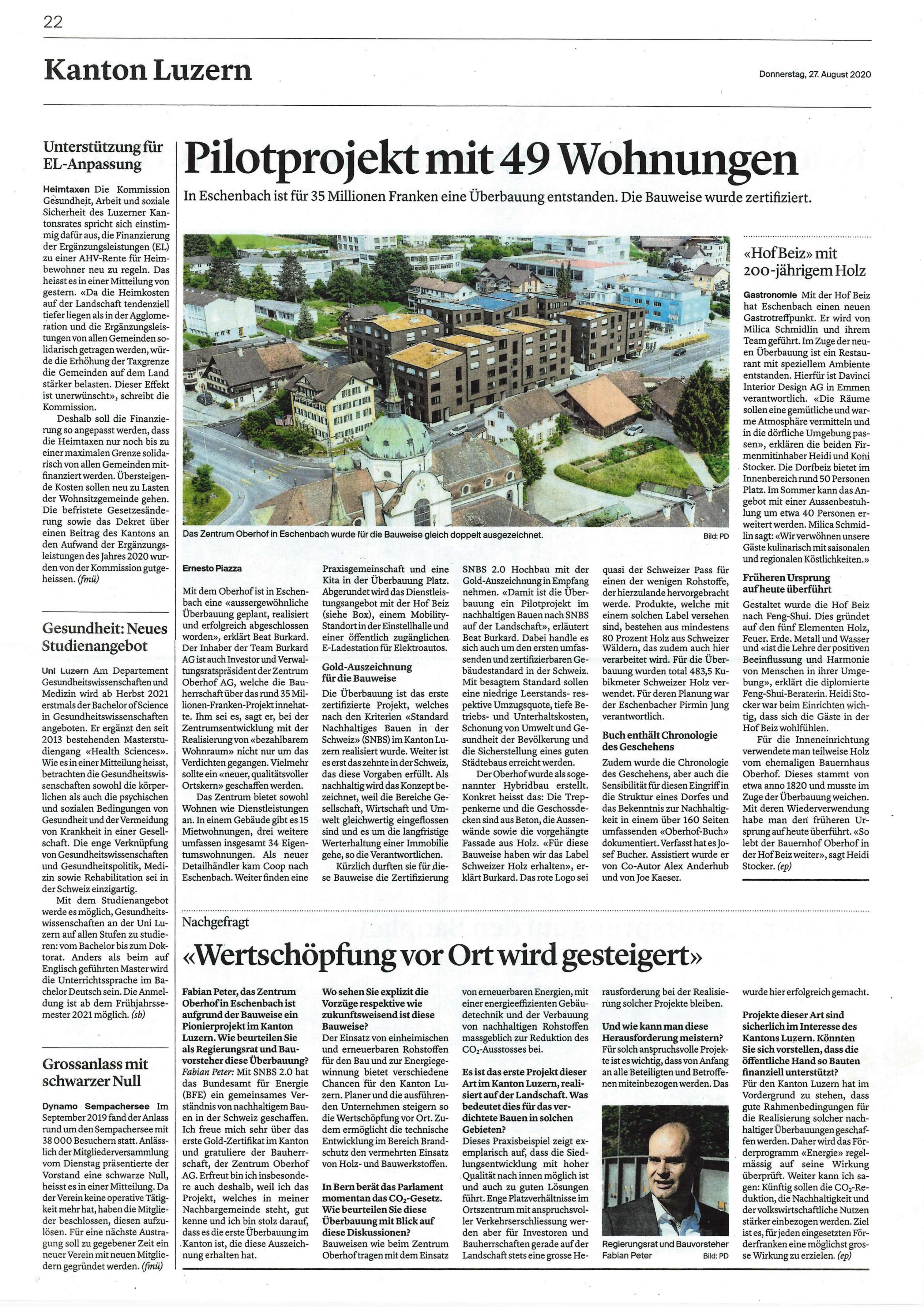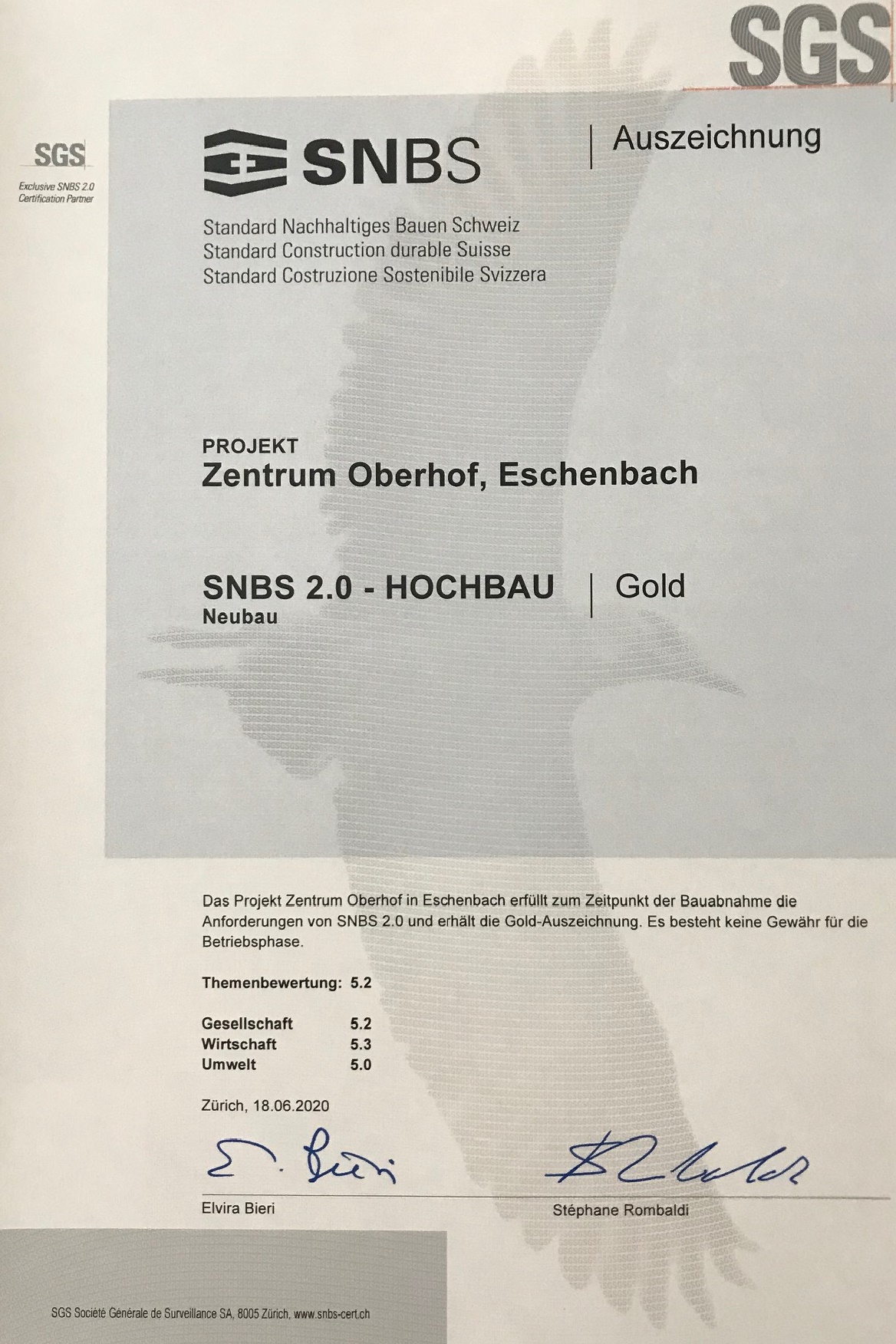 Das Zentrum Oberhof ist das erste zertifizierte SNBS Projekt im Kanton Luzern und in der Schweiz das 10te zertifizierte Projekt überhaupt. Damit gehört der Oberhof zu einem Pilotprojekt im Nachhaltigen Bauen nach SNBS.