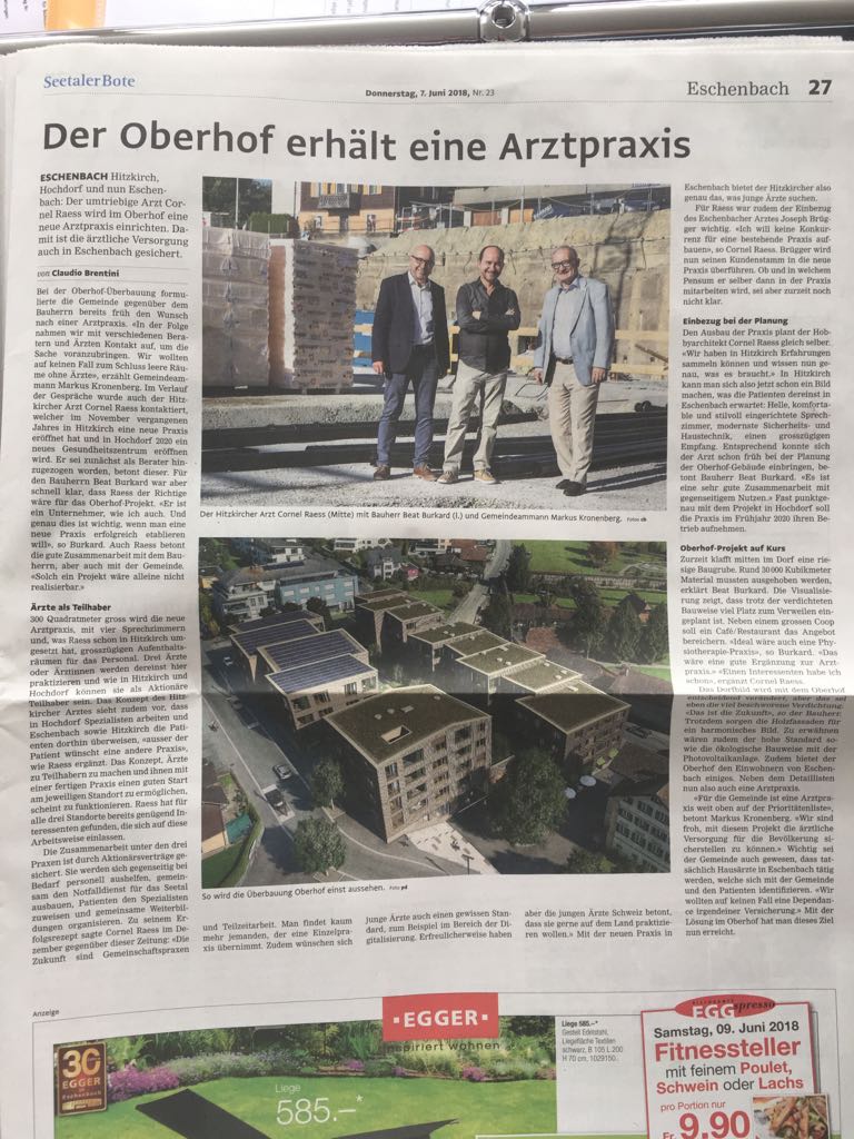 Der Gemeinderat hat sich schon vor Jahren mit Dr. Brügger über die Entwicklung der medizinischen Versorgung ausgesprochen. So war es naheliegend, dass Beat Burkard, der Investor der Überbauung Oberhof, vom Gemeinderat darauf angesprochen wurde. „Mir war sofort klar, dass ich da Hand bieten muss“. Dass mit dem unternehmerisch denkenden Dr. Raess aber so schnell eine überzeugende Lösung gefunden wurde, ist sehr erfreulich.