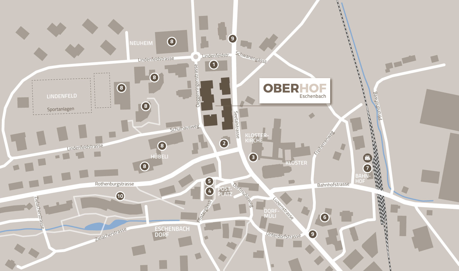 Das Oberdorf von Eschenbach wird durch das ortsspezifische Freiraum- und Bebauungskonzept Oberhof qualitativ gestärkt. Mit der Setzung der Bauten und entsprechender Nutzungsanordnung wird zusammen mit dem «Försterhaus» der Oberhofplatz gebildet. Durch die Versetzung der Gebäudevolumen in Höhe und Grundriss wird ein differenzierter Bezug der Zeilenbebauung zu den Frei- und Strassenräumen erreicht.